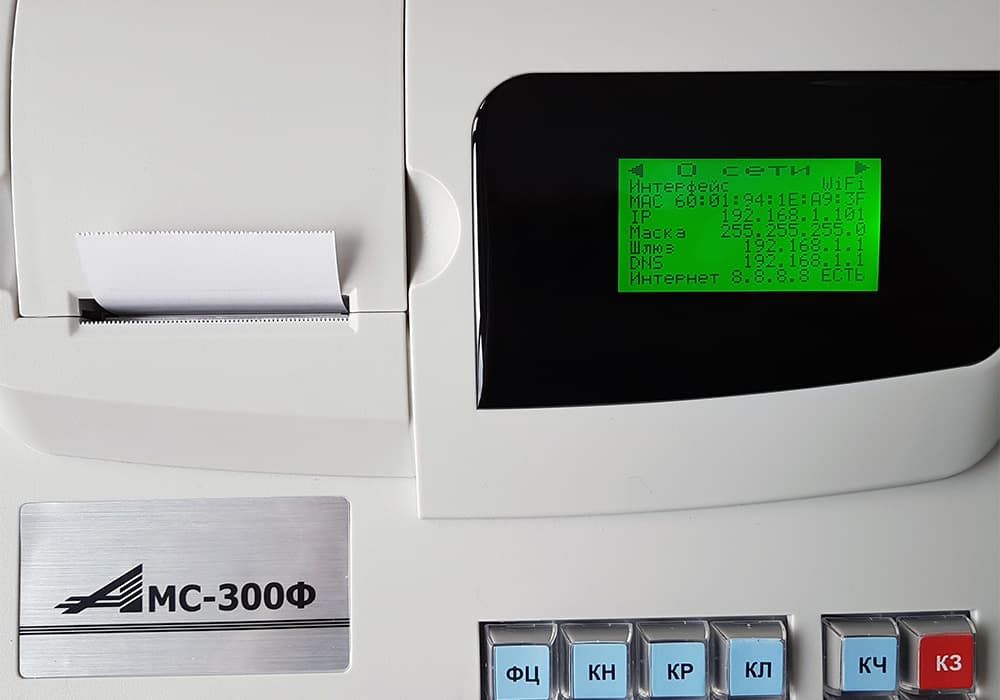 • Для проверки подключения, после того как касса включится, нажмите на кнопку АМС 300Ф кнопка проверки сети в виде глобуса и взгляните на последнюю строку, если ККТ подключилась к интернету, то там будет написано ИНТЕРНЕТ ЕСТЬ.