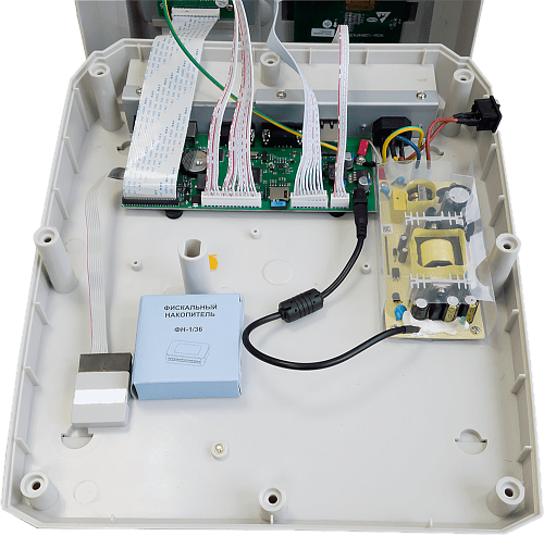 К АМС-300Ф можно подключить много внешних устройств, например USB или COM сканер штрих-кодов. Размер корпуса позволяет разместить следующие порты: USB-A, USB-B, порт RS-232 для денежного ящика, порт RS-232 для подключения компьютера, порт LAN.