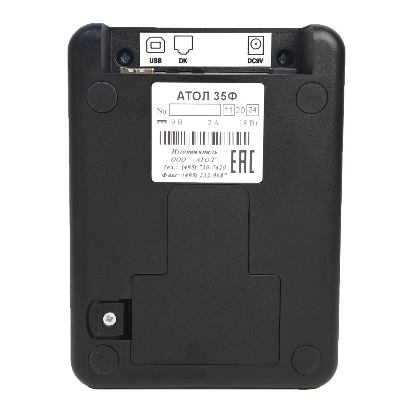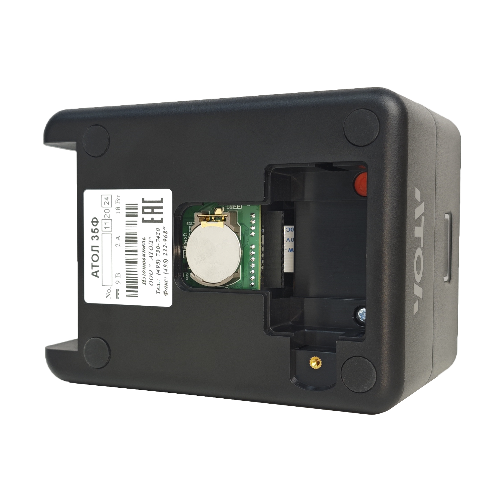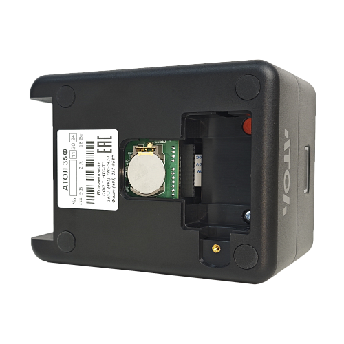 Если у Вас ограниченно пространство под кассовый аппарат, то этот фискальный регистратор не займет много места у Вас на рабочем столе или прилавке. Квадратная форма без выступающих деталей. Оснащен металлической гребенкой для отреза чеков. Корпус из прочного антистатического пластика надежно защищает печатающий механизм от повреждений, пыли и мелкого мусора. Удобная конструкция позволяет получить быстрый доступ к батарейке таймера и ФН без вскрытия корпуса. Яркий световой LED индикатор на передней панели АТОЛ 35Ф будет уведомлять вас о состоянии ККТ, отсутствии ленты, ошибках печати и т.п..