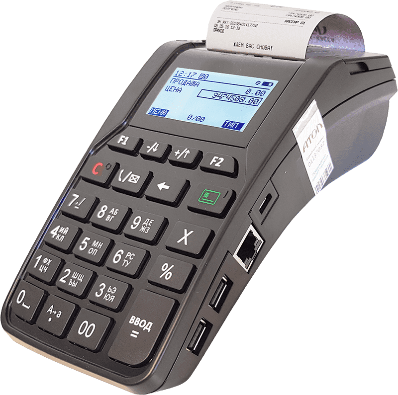 Мобильный (переносной) кассовый аппарат со встроенным аккумулятором и пластиковой клавиатурой с удобными огромными клавишами.