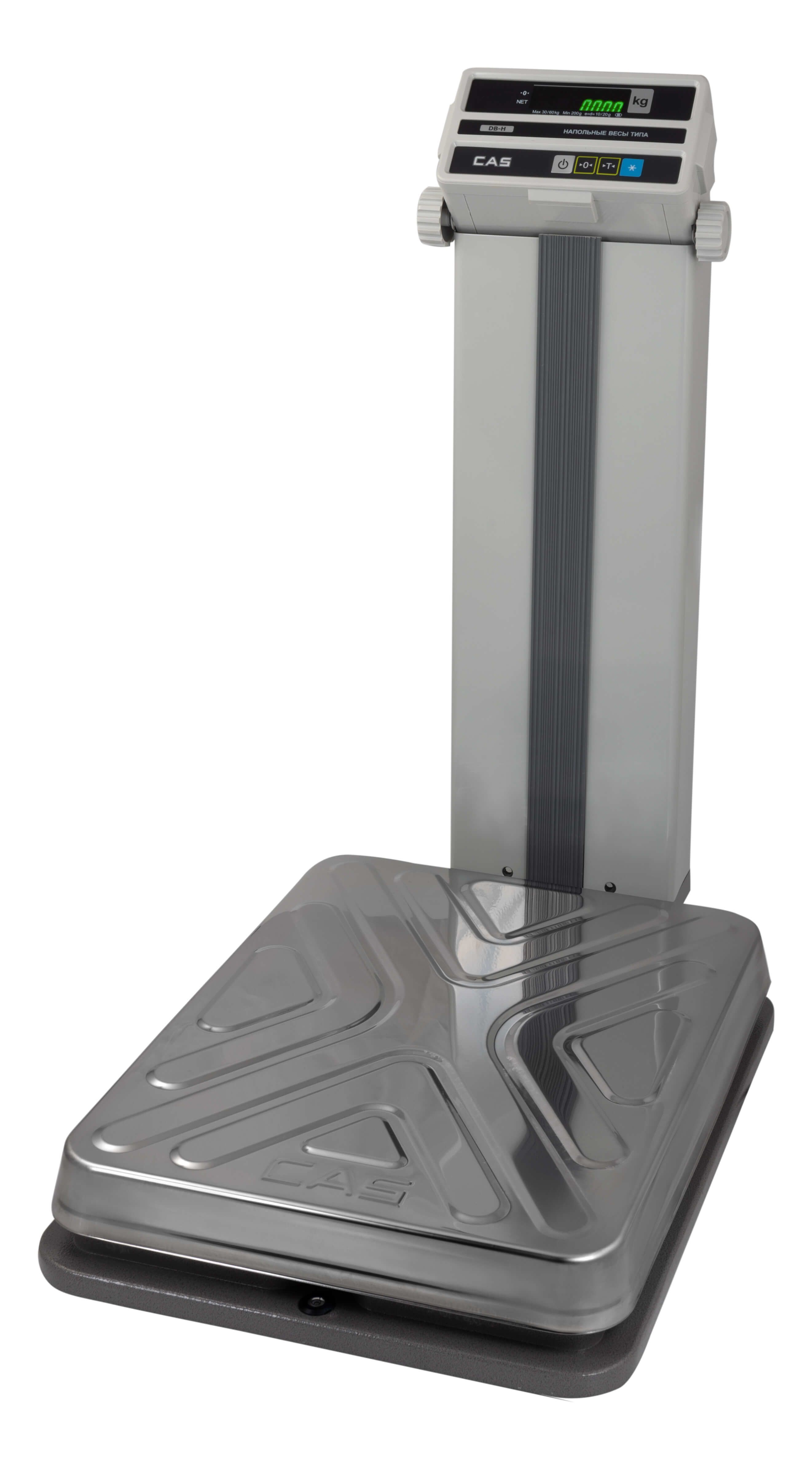 Напольные весы CAS DB-60H от корейского производителя. По умолчанию имеют интерфейс RS-232. В весы встроен ВЛ-дисплей. Так же они позволяют вести многократное тарирование и учет массы тары.