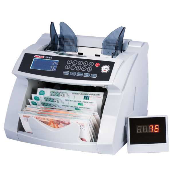 Счетчик банкнот DoCash 3000 L имеет функции пересчета банкнот, проверки по размеру, подсчета итоговой суммы, фасовки. Кроме этого, счетчик обладает функциями детектора подлинности банкнот с помощью контроля размера и оптической плотности. Скорость счета можно установить в пределах 1500 купюр в минуту.