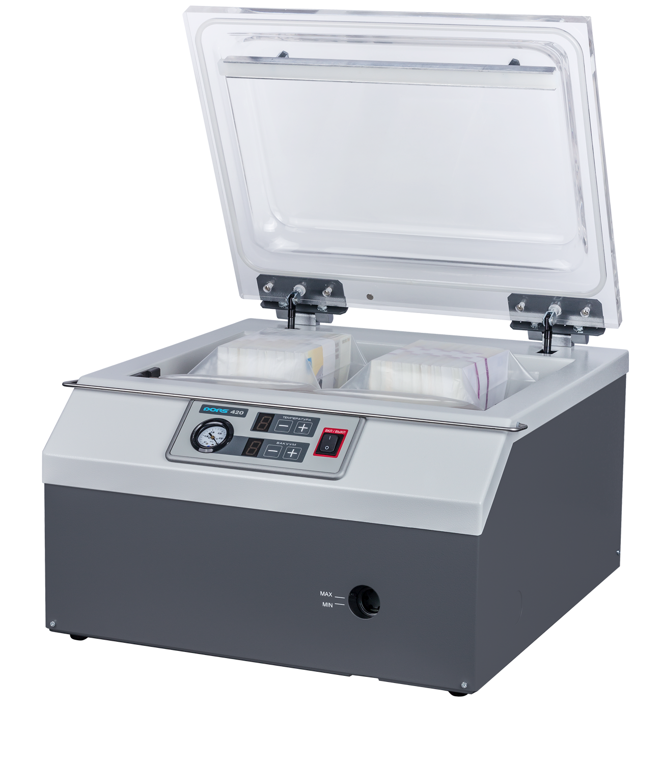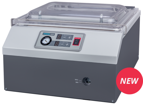 Вакуумный упаковщик банкнот DORS 411 со скоростью упаковки 8 пакетов в минуту. Одновременно могут упаковываться два пакета. Длина сварного шва составляет 460 мм. Есть возможность печати реквизитов на заварочном шве. Размер камеры составляет 470 / 350 / 100 мм. Температура и глубина вакуума могут устанавливаться вручную и сохраняться в памяти устройства. Можно применять силиконовое и фторопластовое клише. Излишки пакета обрезаются автоматически.