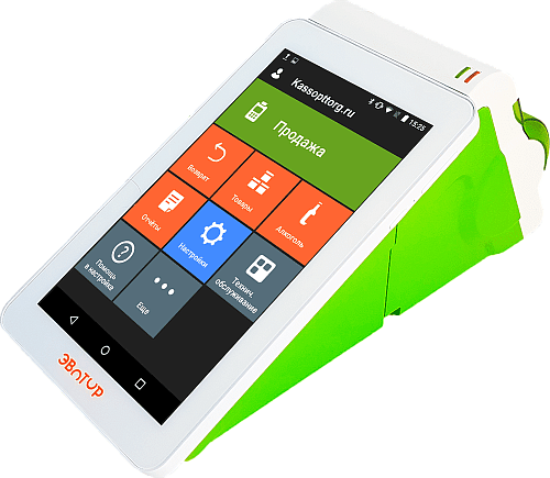 Онлайн-касса под ФЗ-54 на основе планшета с бесплатным подключением к Сбербанк эквайрингу. Очень удобен для работы кассира, если требуется занесение наименования товаров в чек. Поддерживает облачное хранение данных в системе Эвотор.