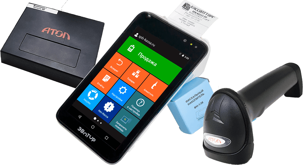 Стационарный, но со встроенным аккумулятором, кассовый аппарат на основе планшета на Андроиде со встроенным сканером 2D, блоком УТН для работы с ЕГАИС, встроенным фискальным накопителем на 36 месяцев и передачей данных онлайн под ФЗ-54.