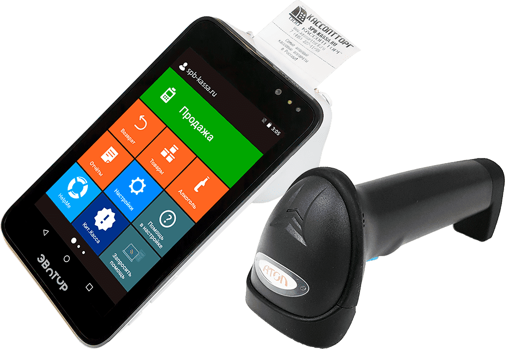 Стационарный, но со встроенным аккумулятором, кассовый аппарат на основе планшета на Андроиде со встроенным сканером 2D для работы с ЕГАИС и передачей данных онлайн под ФЗ-54.