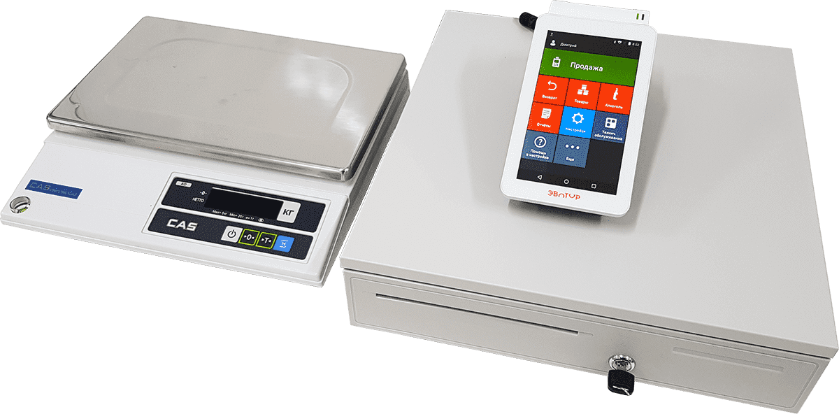 В комплекте с терминалом идут установленные и настроенные весы CAS AD-05 и автоматический денежный ящик. Точка продаж на основе смарт терминала Эвотор с подключенными весами и автоматическим денежным ящиком. Вес с весов автоматически передается на кассовый аппарат, остается только выбрать товар и нажать кнопку: оплатить.