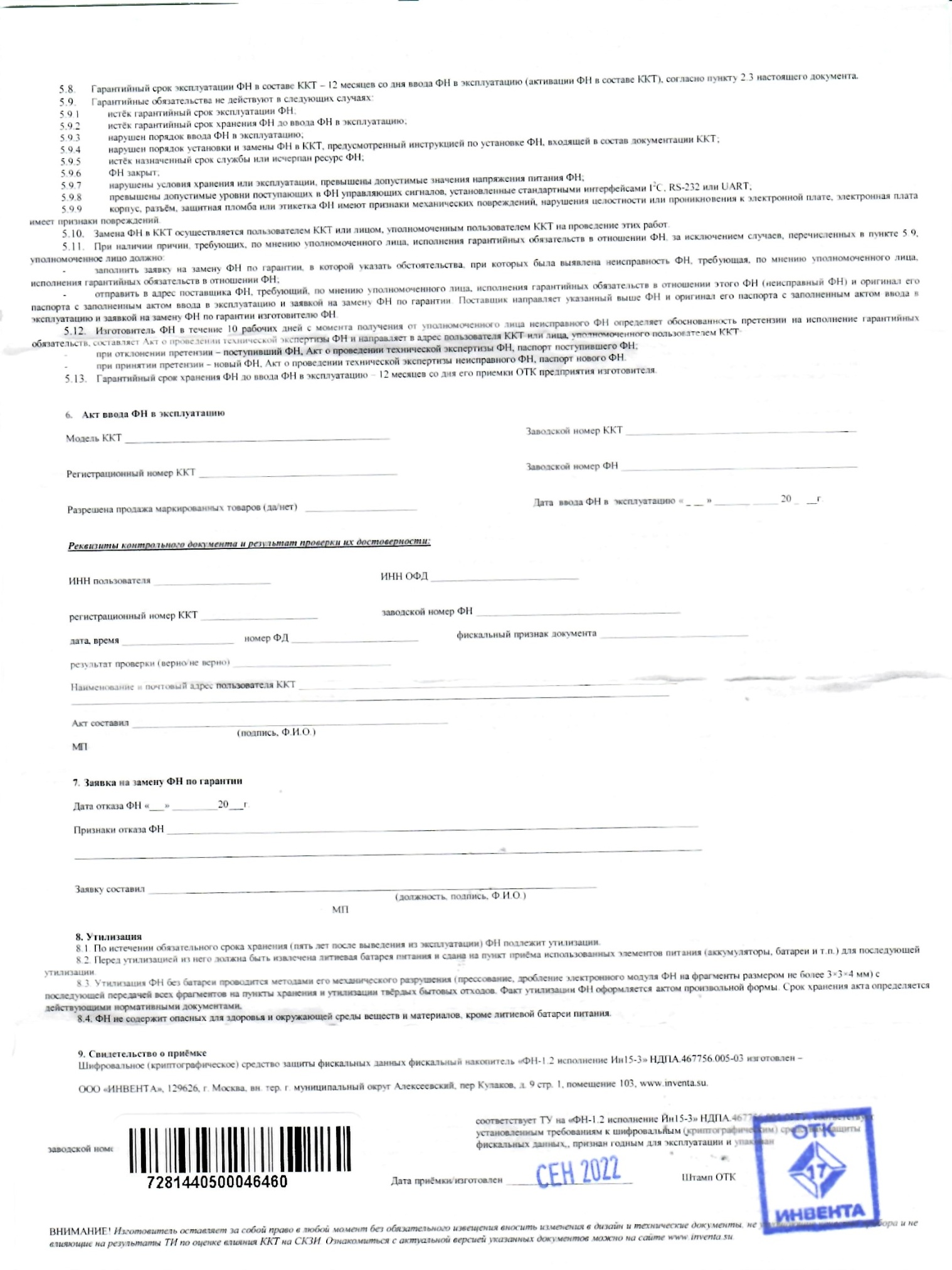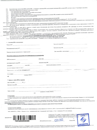 • шифровальное (криптографическое) средство защиты фискальных данных фискальный накопитель "ФН-1.1М исполнение Ин15-1М". Этот накопитель в настоящее время не производится из-за недостатка комплектующих (санкции), но на рынке его еще осталось много из старых запасов - его можно использовать наравне с другими ФН;