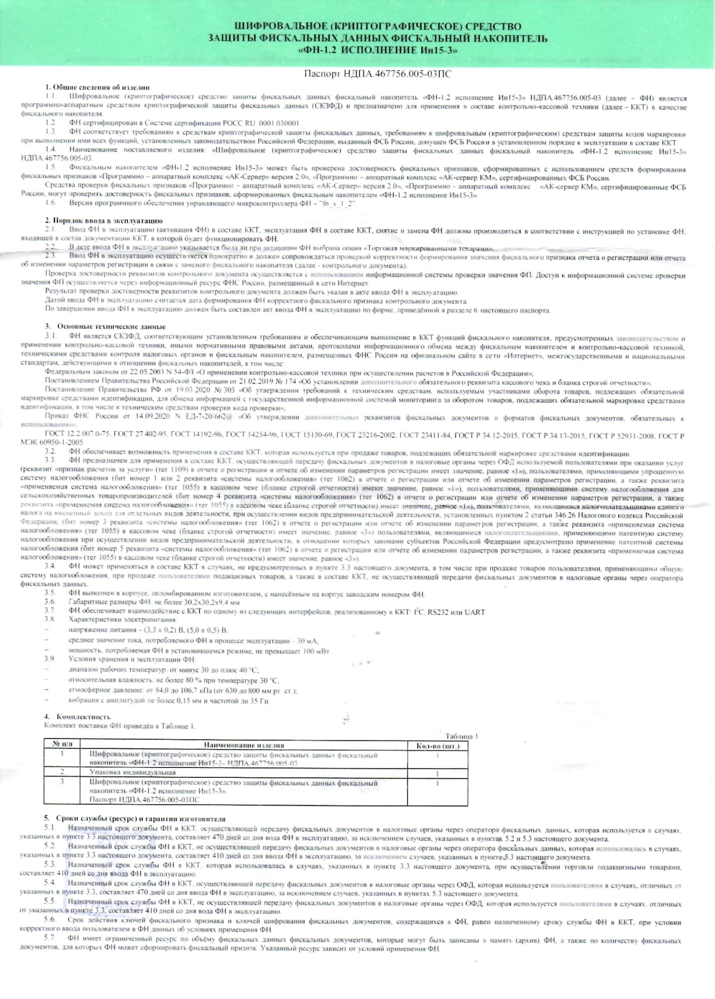 • шифровальное (криптографическое) средство защиты фискальных данных фискальный накопитель "ФН-1.2 исполнение Ин15-3";