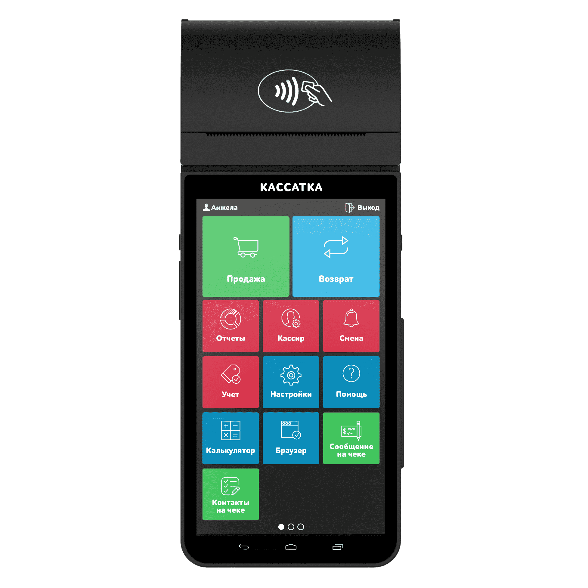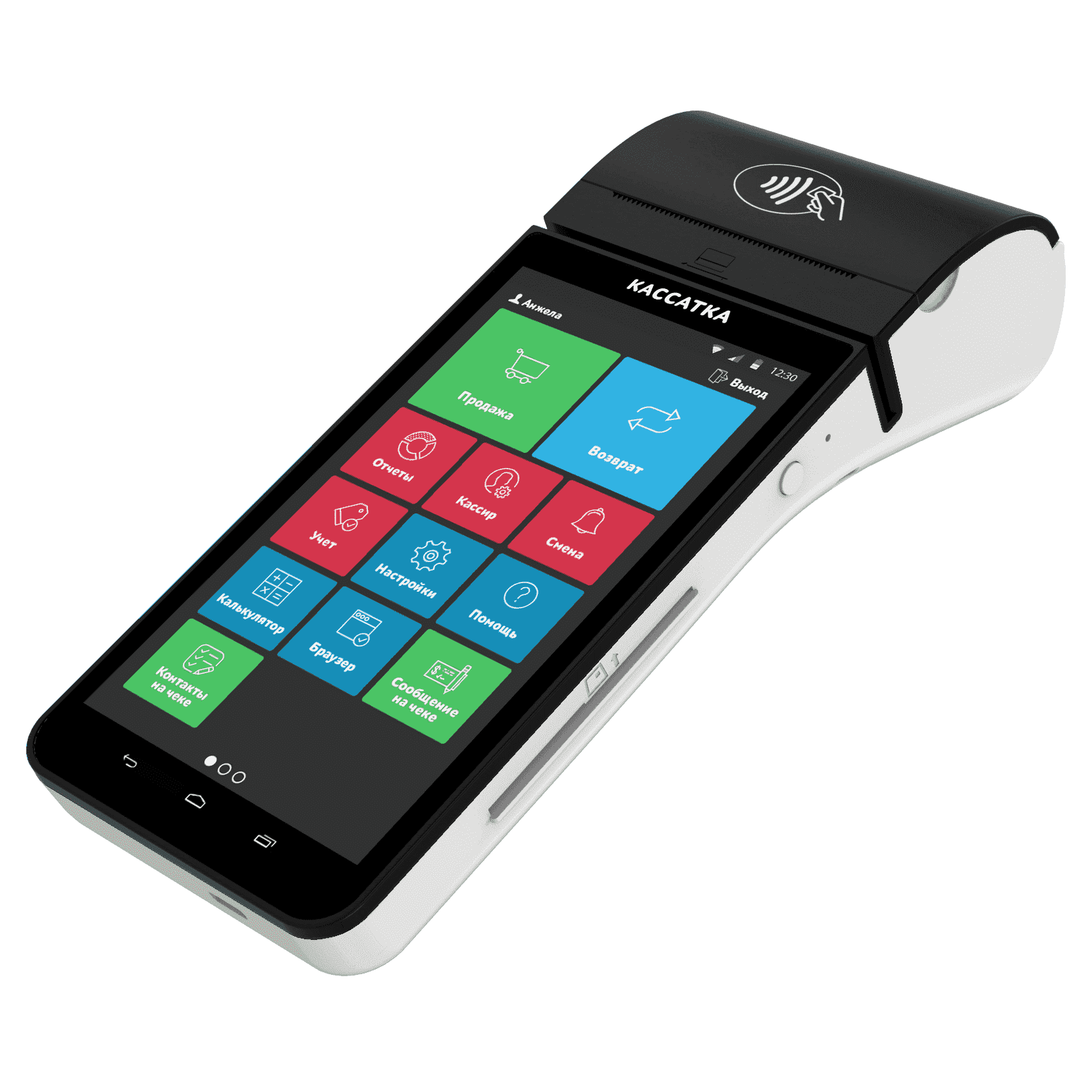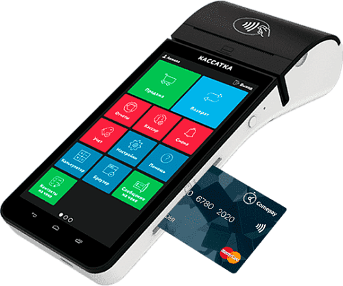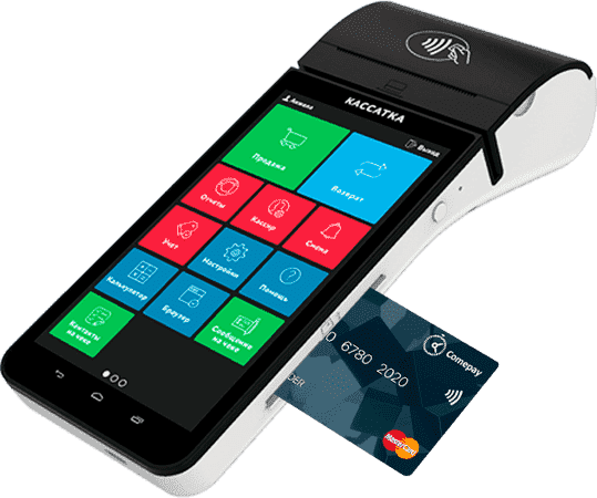 Переносной (мобильный) кассовый аппарат на основе планшета со встроенным банковским терминалом для приема платежей по банковским картам, камерой-сканером и аккумуляторами.