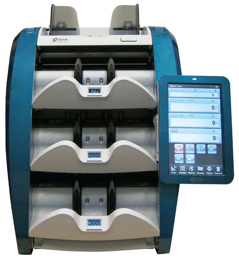 Kisan Smart - это трехкарманный счетчик банкнот с функциями сортировщика и детектора. Скорость счета 1000 купюр в минуту. Загрузочный карман емкостью 200 банкнот, приемный также 200. Одновременно могут обрабатываться до 10 видов валют. Сортировка возможна по ориентации, лицу, номиналу, ветхости, году эмиссии и для банкоматов. Есть режим фасовки по количеству и сумме, сканирование и сравнение серийных номеров. Устройство можно интегрировать с ИТ системой, подключить принтер и монитор. Кроме всего, счетчик обладает большим перечнем видов детекции подлинности банкнот. 7" дисплей отображает сенсорный дисплей отображает информацию по каждому карману.