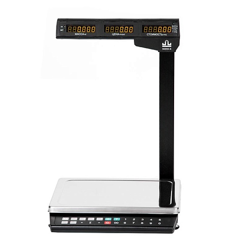 Торговые настольные весы МАССА-К MK-15.2-ТН21(RU) со встроенным аккумулятором, который обеспечивает работу весов до 50 часов. На небольшой складной стойке с двух сторон располагаются ЖК дисплеи. Есть возможность автоматического расчета сдачи и суммирования стоимости единицы товара. Связь с внешними устройствами осуществляется через интерфейсы RS-232 и USB.