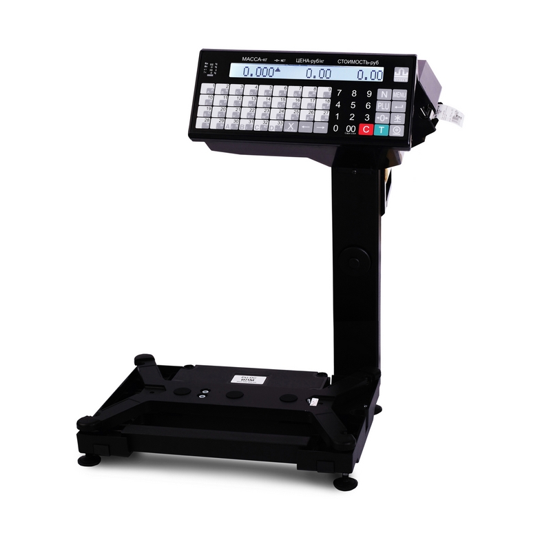 Настольные весы МАССА-К ВПМ-15.2-Т с вертикальной стойкой, на которой расположен терминал с прорезиненной клавиатурой и ЖК дисплеем, а так же принтер этикеток. В весы можно сохранить до 20000 товаров. Связь с внешними устройствами осуществляется через интерфейсы RS-232, Ethernet, USB.