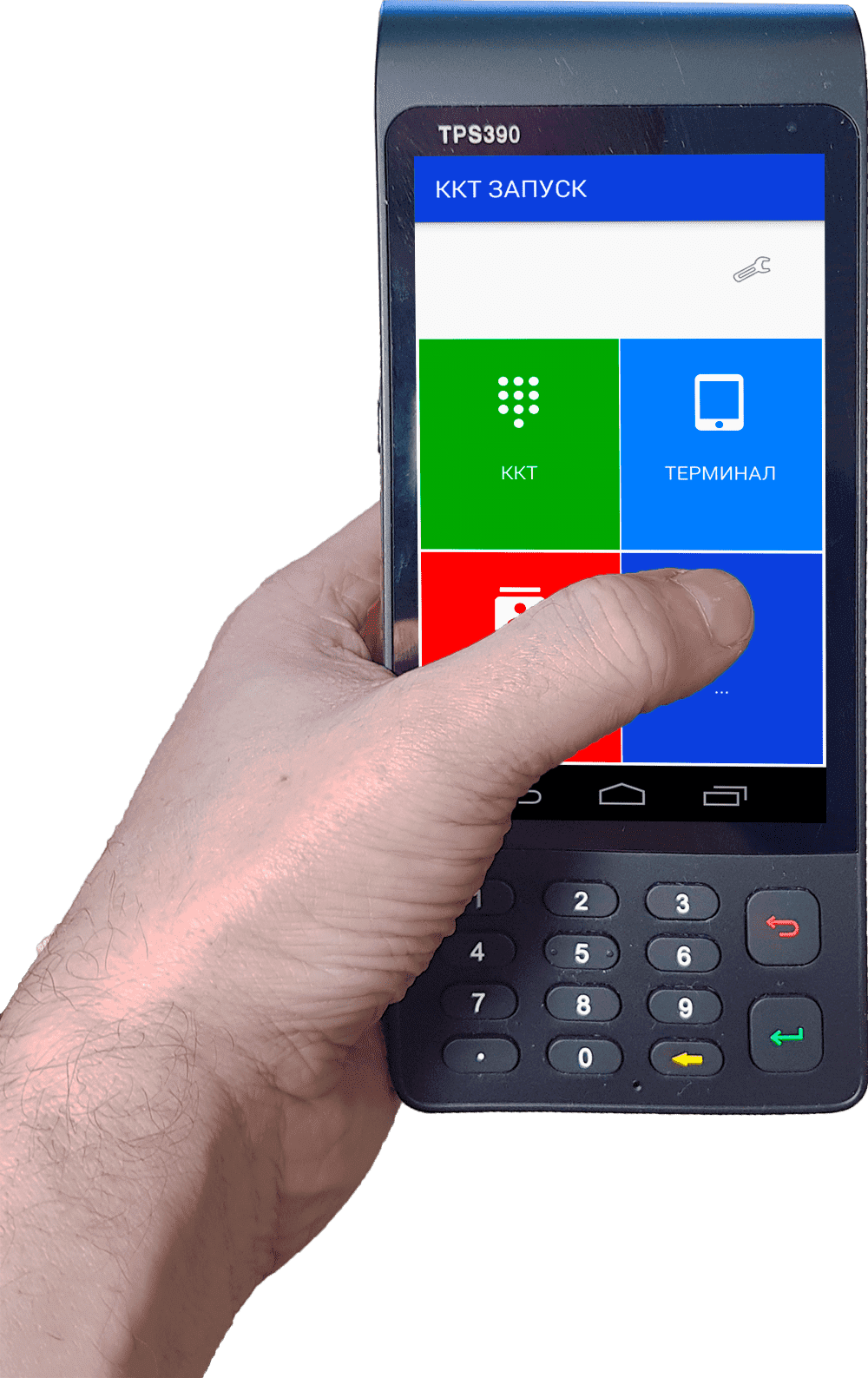 Мобильный кассовый аппарат под ФЗ-54 с сенсорным экраном, кнопочной клавиатурой, с возможностью приема банковских карт и встроенным фискальным накопителем на 15 месяцев.