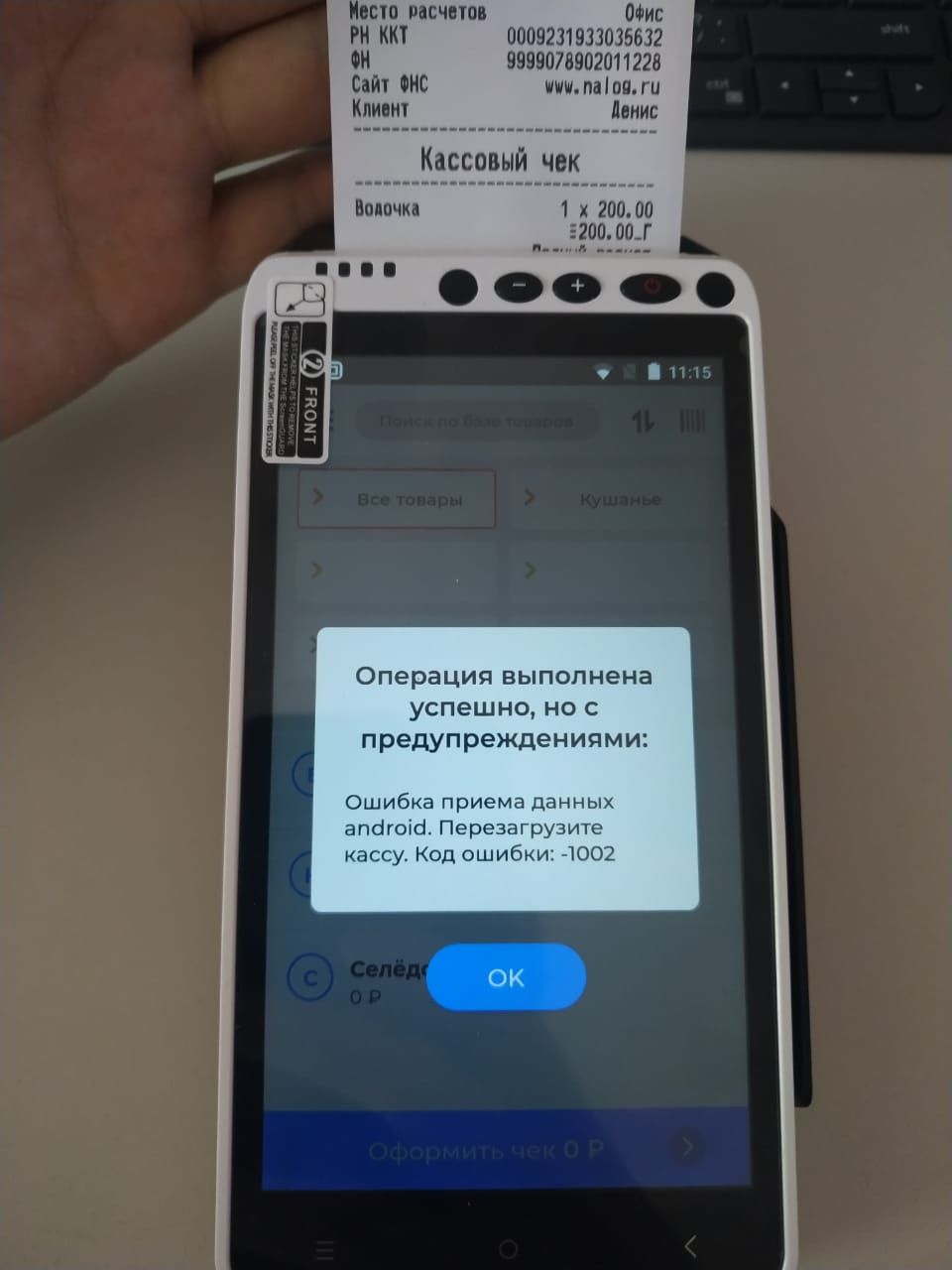 Ответ службы поддержки:ПодробнееПричиной этому является сбой в кассовом ядре Android, сама ошибка подсказывает что нужно перезагрузить кассу.