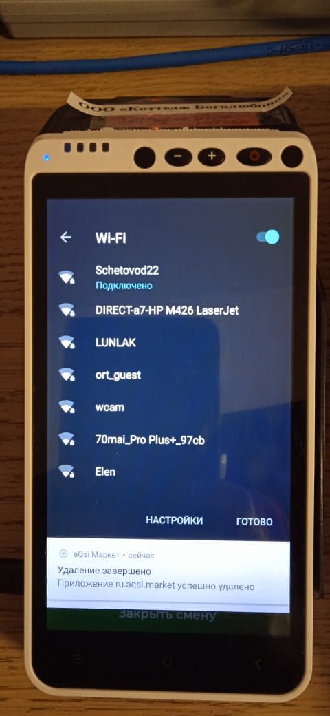 Создан , последнее изменение 09.01.2022Пытаюсь закрыть смену - загорается белый экран и ничего не происходит. К интернету касса подключена. Так же внизу экрана появилась надпись: "aQsi Маркет сейчас Удаление завершено. Приложение ru.aqsi.market успешно удалено. Хотя мы ничего не удаляли.