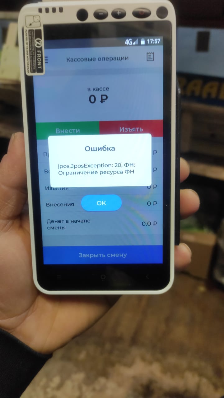 Создан , последнее изменение 09.01.2022Полностью ошибка выводится так: "Ошибка jpos.JposException: 20, ФН: Ограничение ресурса ФН". Как исправить?