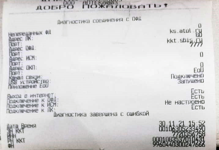- Если же на чеке будет написано "Диагностика завершена с ошибкой", то позвоните к нам по телефону, указанному в контактах, и мы проверим настройки кассы.