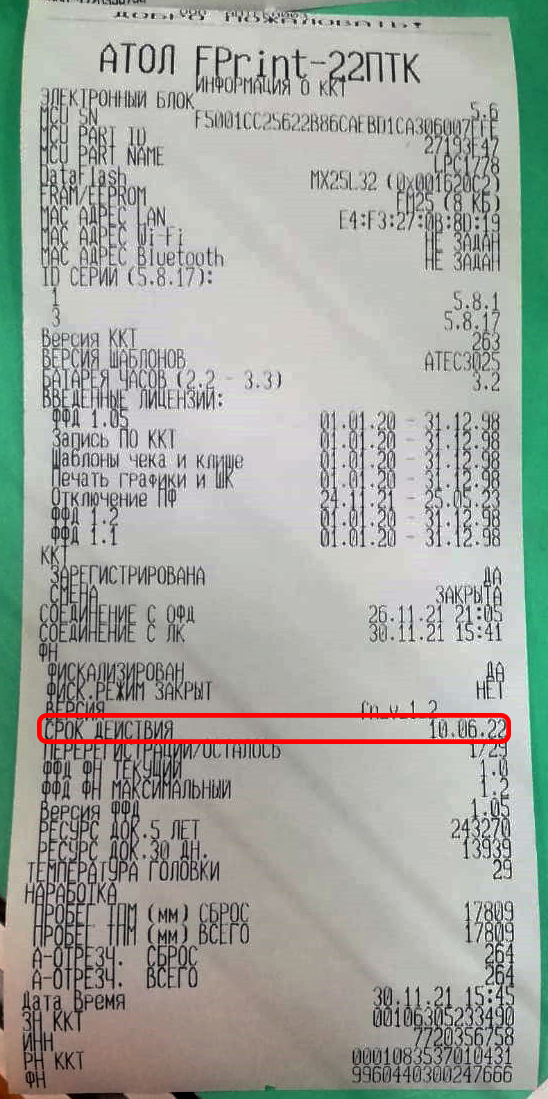 - выйдет чек, в графе СРОК ДЕЙСТВИЯ будет указана дата окончания действия фискального накопителя, который установлен в данный момент в Атол: