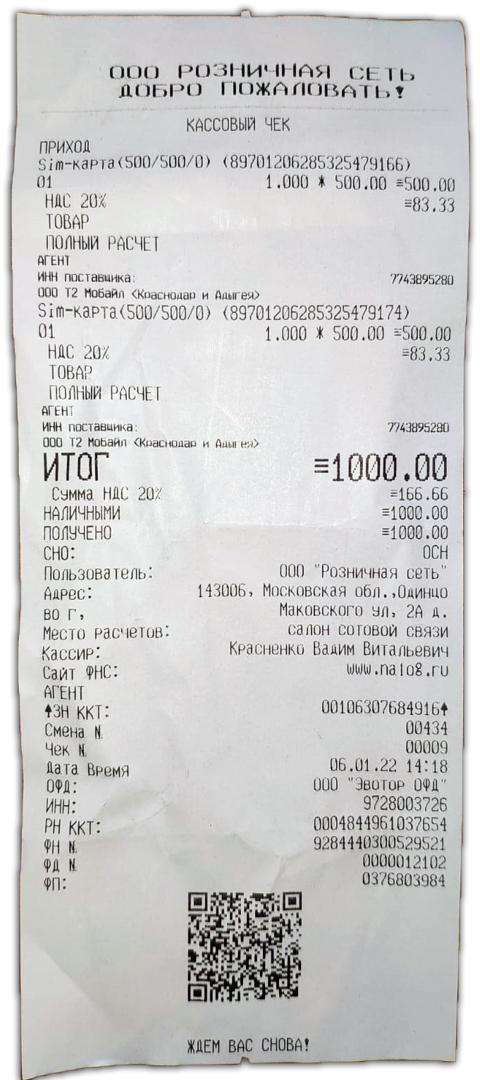Создан , последнее изменение 24.01.2022Образец кассового чека салона сотовой связи ООО за наличные, данные и реквизиты на чеке: номер документа, QR-код, проверка онлайн
