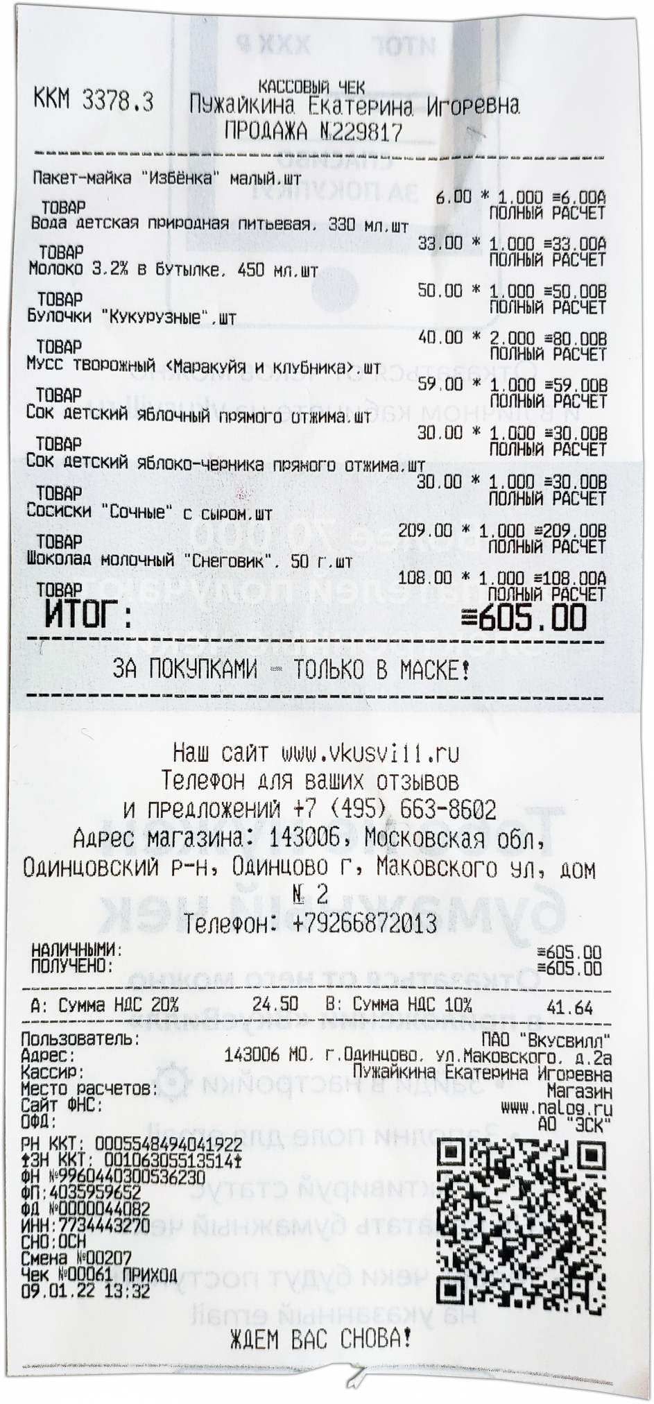 Создан , последнее изменение 19.01.2022Образец кассового чека магазина Вкусвилл за наличные, данные и реквизиты на чеке: номер документа, QR-код, проверка онлайн