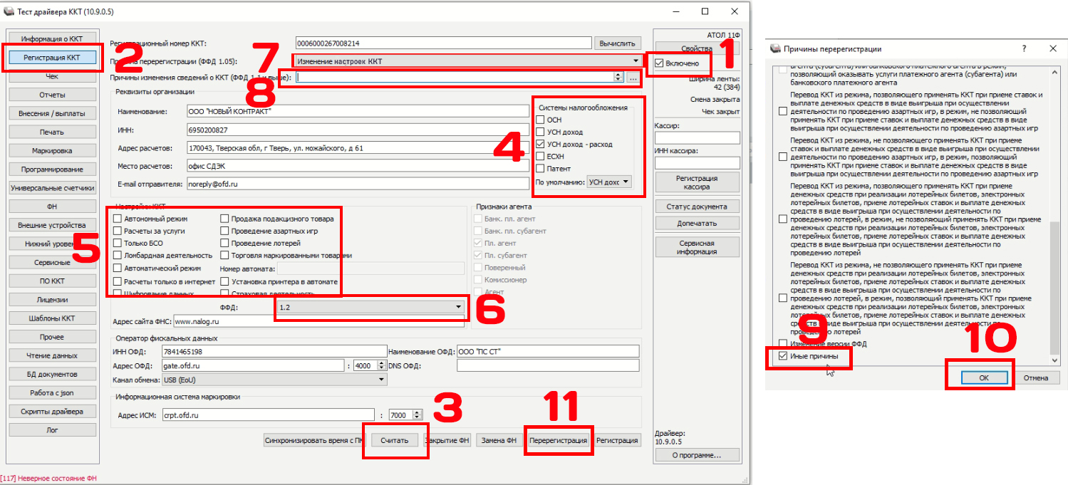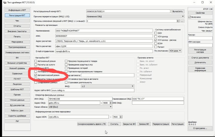 Сделали перерегистрацию кассы через Драйвер Атол ККТ с верными реквизитами: