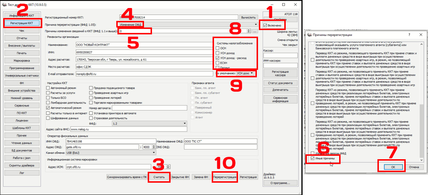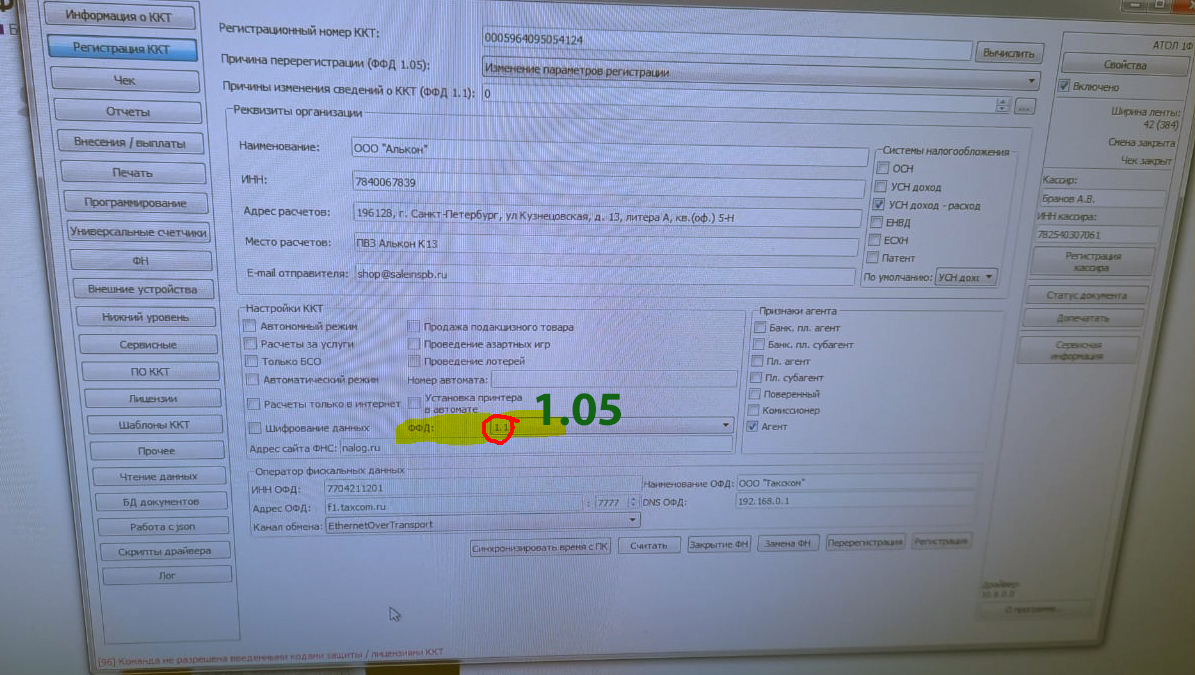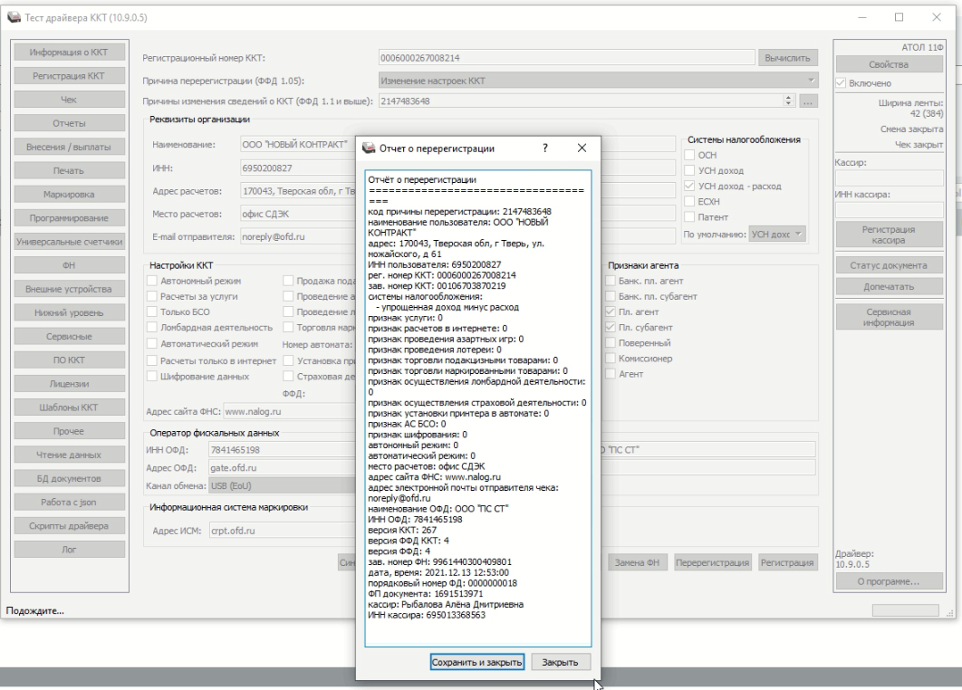 Сделали перерегистрацию кассы через Драйвер Атол ККТ с верными реквизитами: