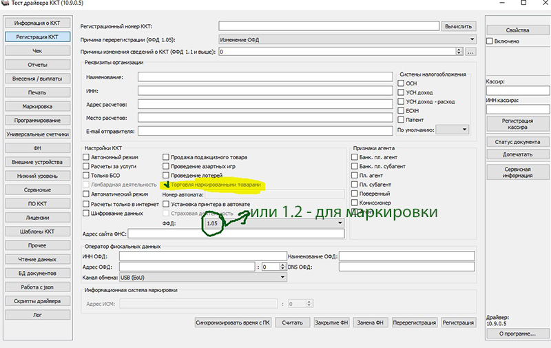 Если же маркировкой вы не пользуетесь, то в этом поле в вашем Драйвере (в котором вы сейчас регистрируете кассу) поставьте ФФД 1.05.