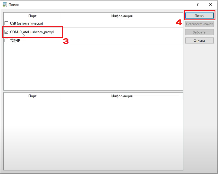 - установите галочку напротив номера COM-порта, который может иметь какое-угодно значение и нажмите кнопку Поиск;