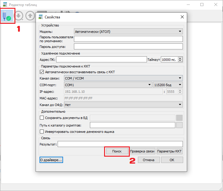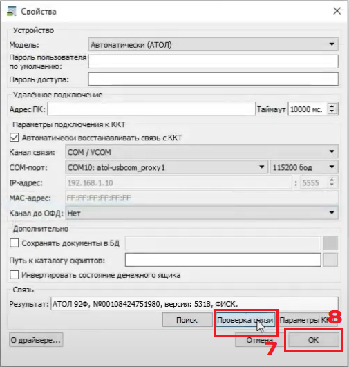 - В окне Свойства нажмите Проверка связи - Ваш АТОЛ должен появиться в окне Результат.