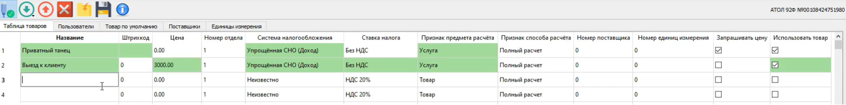 - Все поля, в которые вы внесли изменения, будут у вас в таблице подсвечены зеленым - это означает, что поля не сохранены в кассовый аппарат. Чтобы записать все изменения в кассу нажмите на значок красной стрелочки вверх.