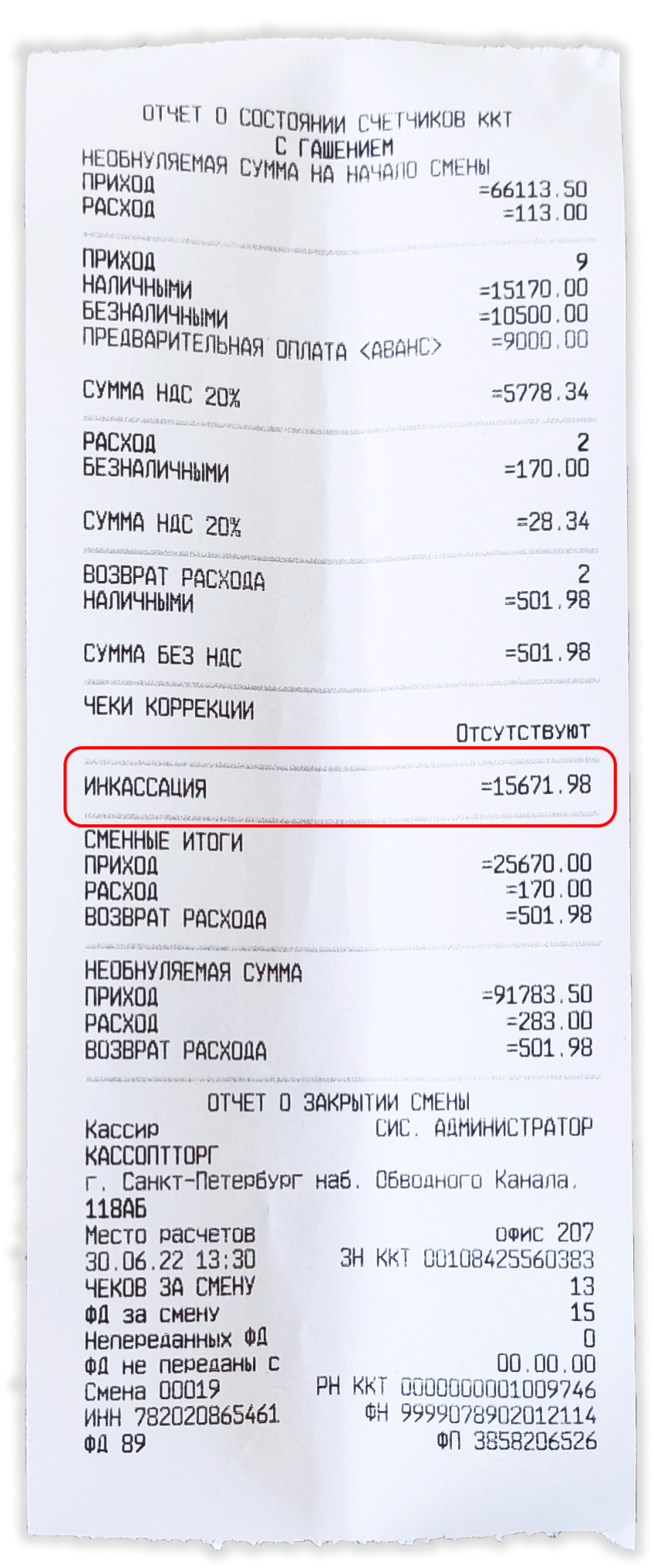 После этих настроек при закрытии смены касса автоматически будет производить изъятие, в Z-отчете это будет отражено строкой “Инкассация”. Следующая смена будет начинаться с нулевой суммой денег в кассе.