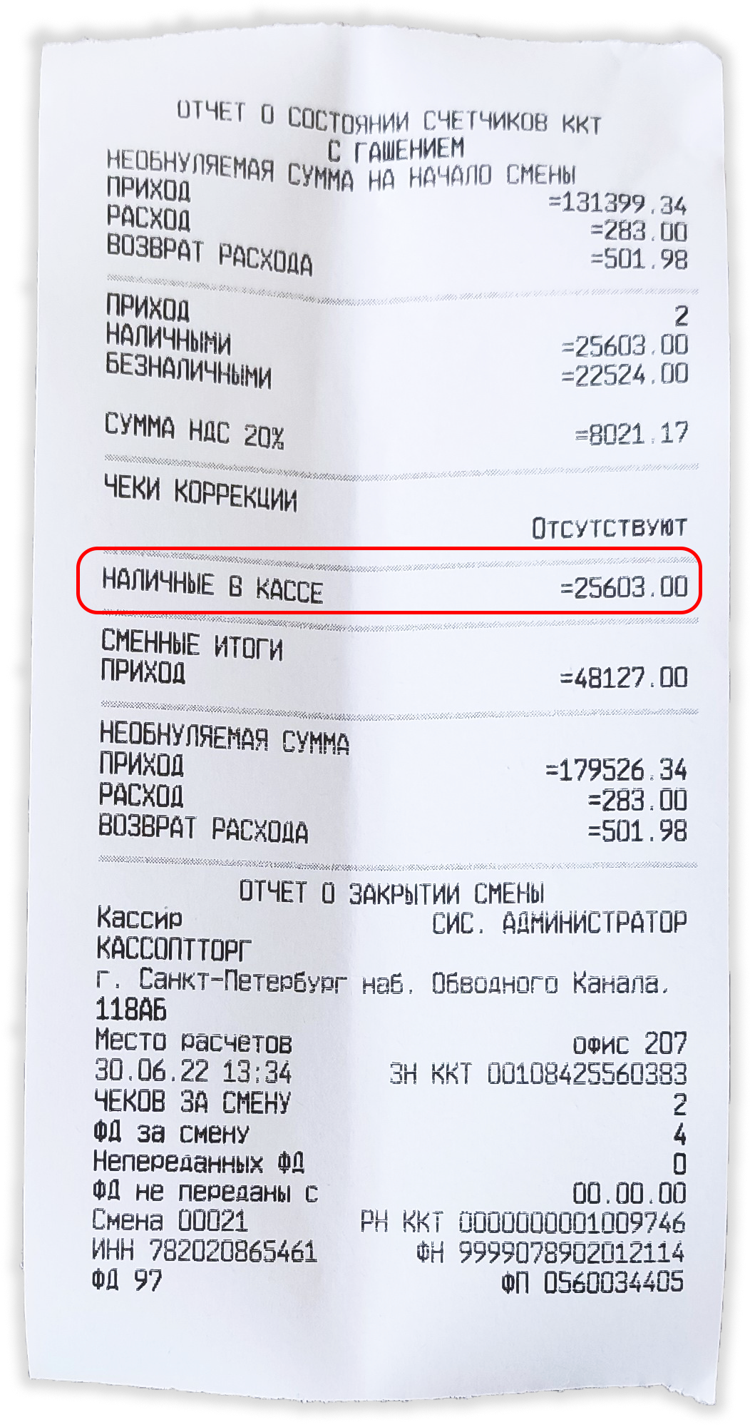 Ответ службы поддержки:ПодробнееКогда на Атоле не включена инкассация после закрытия смены, касса будет считать, что в ней есть деньги. Следующая смена начнется с той же суммы, которая осталась в конце прошлого дня. Эта сумма будет отображена в отчете о закрытии смены строкой “Наличные в кассе”.