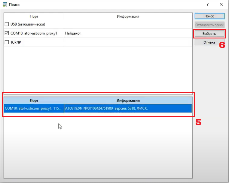 - подождите пока программа найдёт кассовый аппарат по данному порту, после чего нажмите на найденную кассу внизу левой кнопкой мыши и нажмите на кнопку Выбрать;
