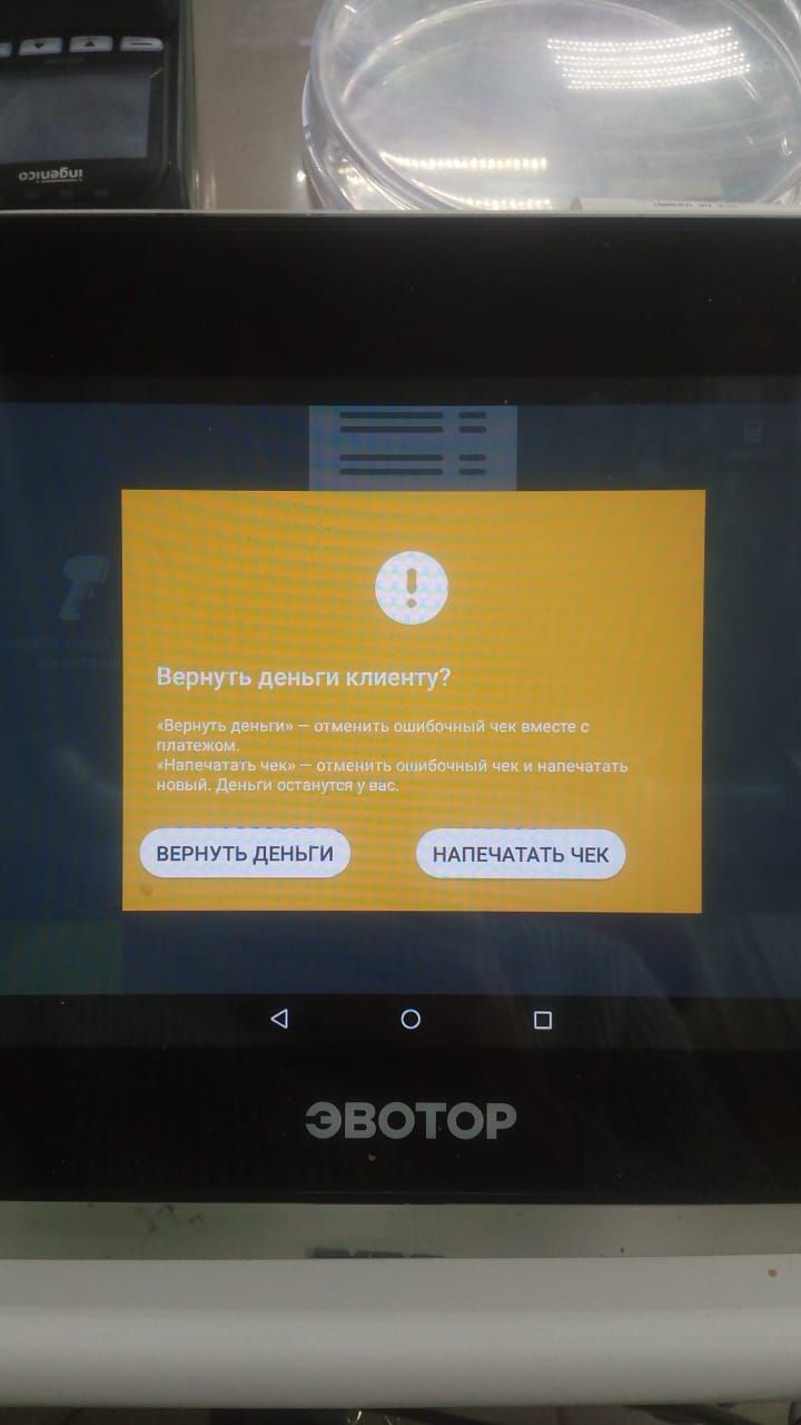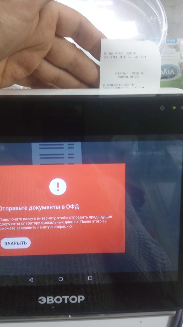 Создан , последнее изменение 15.02.2022После оплаты на терминале показало оплачено и пришла смс, вышла первая часть чека, а на второй эвотор задумался и выдал вот это сообщение и на чеке "Ошибка 235", что делать?