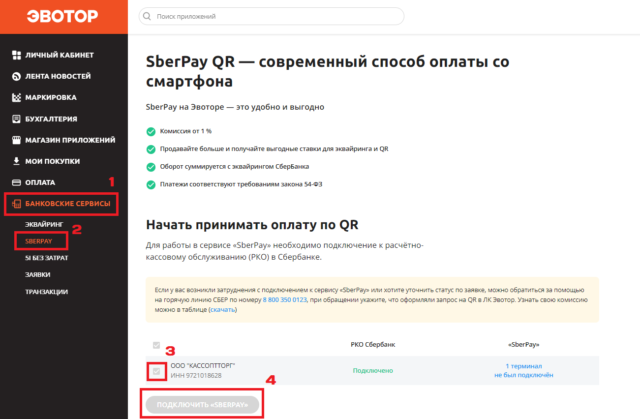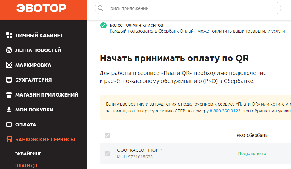 Приложение «SberPay» установится автоматически на все кассы Эвотор, которые привязаны к организации и подключены к сети. Но оплата по QR-коду пока не активна, необходимо дождаться подключения к сервису — для этого с вами свяжется менеджер Сбербанка.