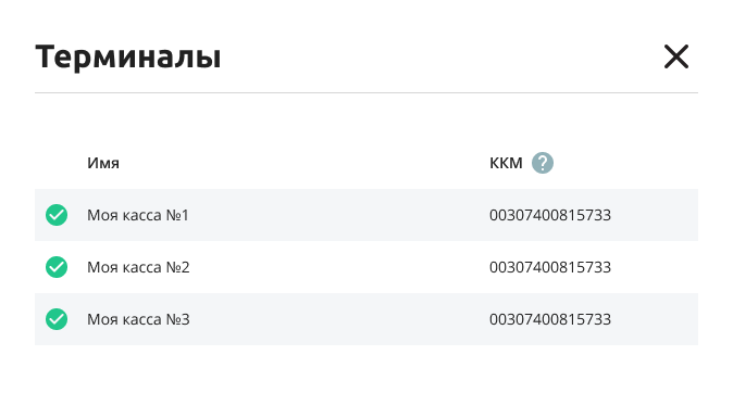 - Когда сервис будет подключён, под столбцом «SberPay» появится надпись Подключены все терминалы, нажав на неё, появится список касс. В этом же списке вы можете подключить к «SberPay»новую купленную кассу Эвотор.