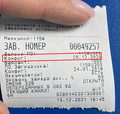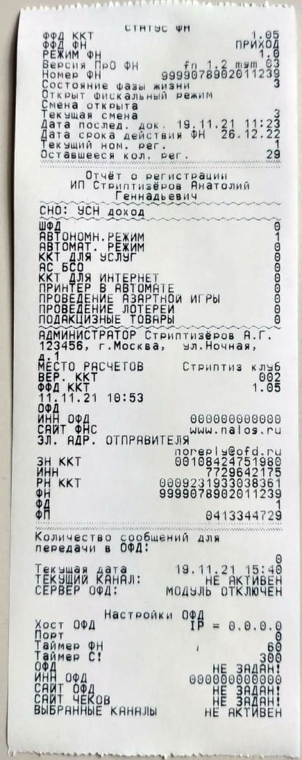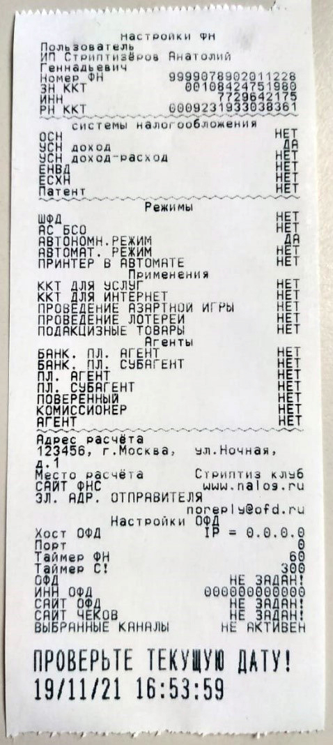 - распечатается чек для проверки введённых данных (внимательно проверьте данные, ошибки в реквизитах или дате могут привести к сокращению срока службы или полной поломке фискального накопителя):