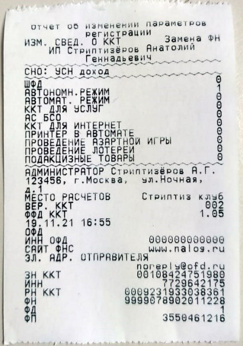 - Если все в порядке, нажмите [ИТ] распечатается чек об изменении параметров регистрации.