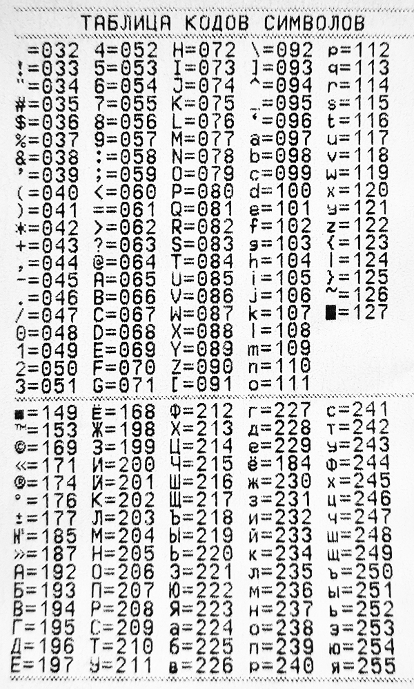- нажмите [ИТ], распечатается "Таблица кодов символов";