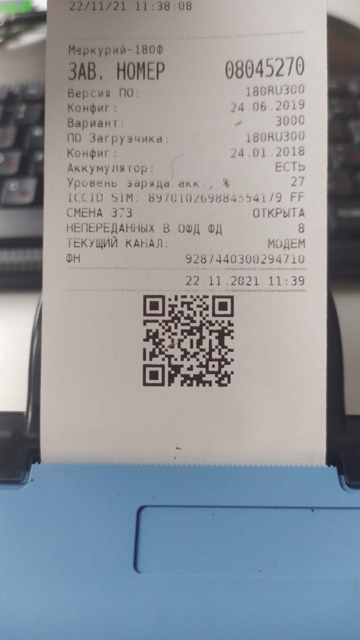 Ответ службы поддержки:ПодробнееСудя по чеку - у вас совсем старая версия прошивки - хорошо бы ее обновить (видео как это сделать в описании - там Меркурий 115Ф - но действия на меркурий 185Ф - абсолютно аналогичные).
