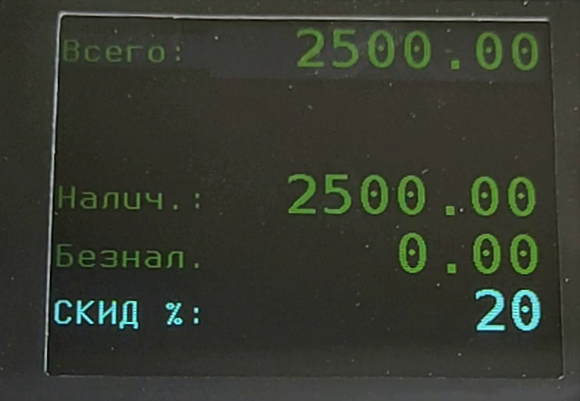 Ответ службы поддержки:ПодробнееСкидки (наценки) могут начисляться как в процентном отношении, так и в абсолютных величинах. Выбор типа скидок определяется последовательным, многократным нажатием клавиши [%]. Также, их можно начислить как на отдельный товар в чеке, так и на сумму всех товаров в чеке в целом.