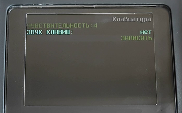 - здесь вы можете выставить значение чувствительности сенсора или, перейдя кнопкой ВНИЗ к следующему пункту, убрать или включить звук при нажатии, для этого кнопкой ВВОД установите необходимое значение: