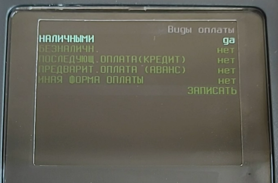 - кнопкой ВНИЗ дойдите до надписи Виды оплаты и нажмите кнопку ВВОД;