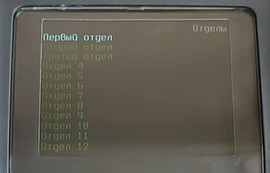 - кнопкой ВНИЗ дойдите до надписи Отделы и нажмите кнопку ВВОД;