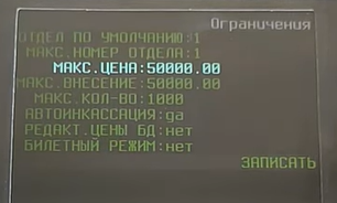- кнопкой ВНИЗ дойдите до надписи МАКС.ЦЕНА и введите максимальную сумму в чеке;