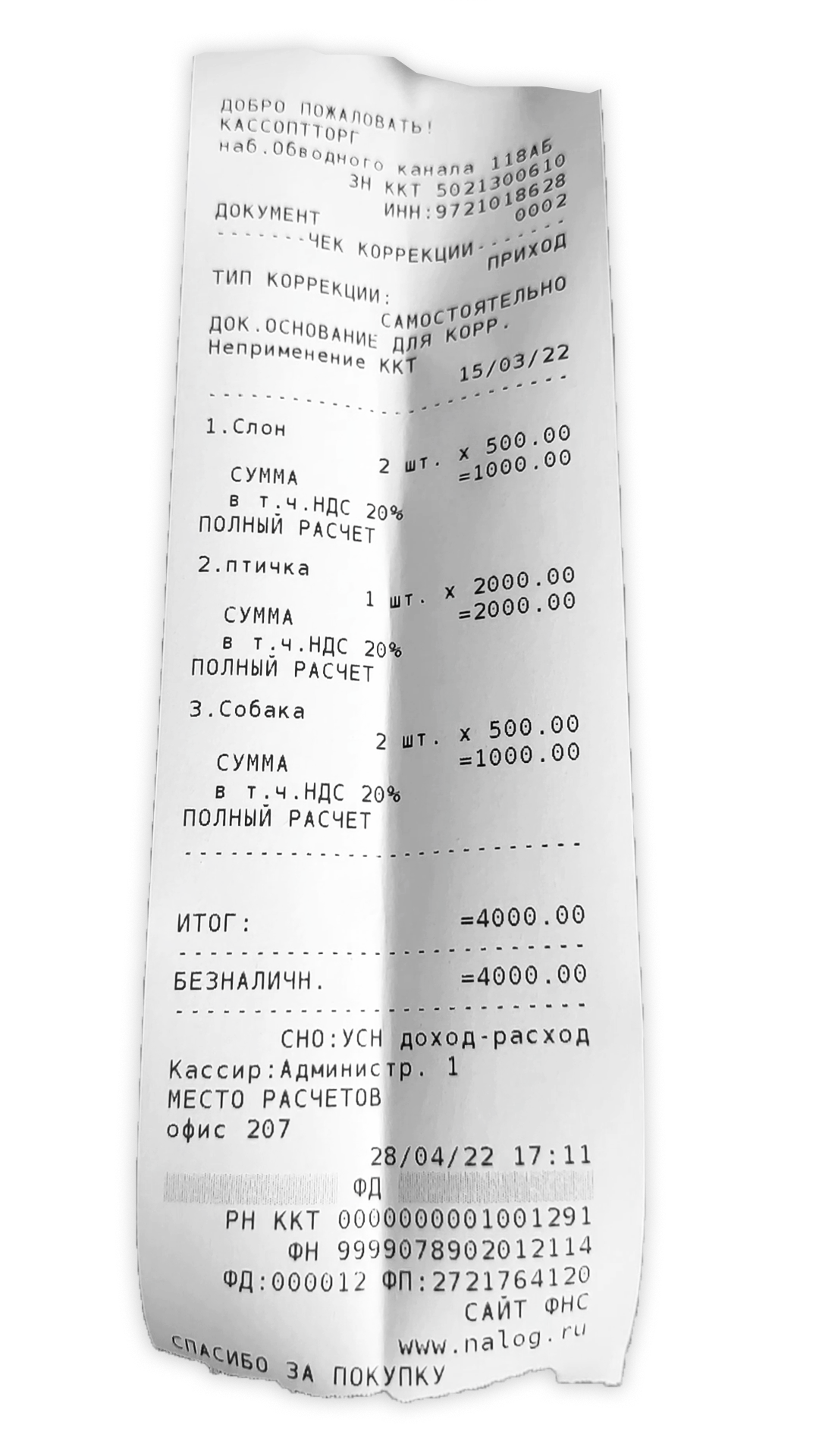 - касса распечатает чек коррекции: