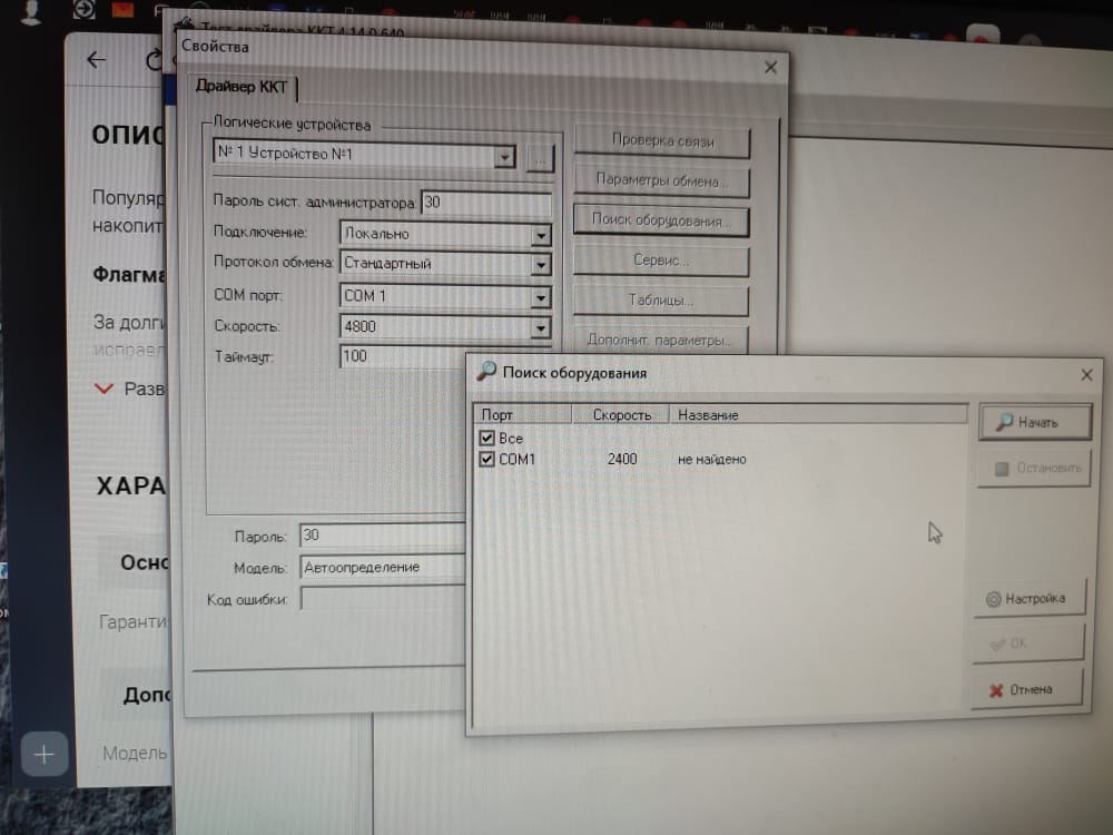 Создан , последнее изменение 08.01.2022Я пытаюсь подключить фискальный регистратор к компьютеру через драйвер ККМ Штрих, но драйвер у меня не видит Штрих-М-01Ф. В "поиске оборудования" пишет: COM 1: не найдено.