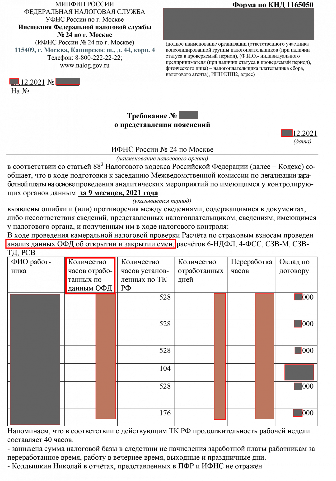 Налоговая инспекция г. Москвы сверила данные из онлайн-кассы с зарплатой, начисляемой работникам. Нашлись несоответствия и налоговая затребовала разъяснений. Все это происходило при камеральной проверке.