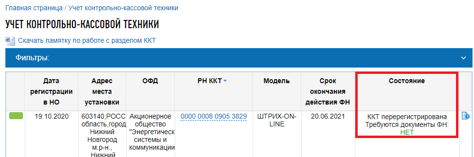 9. После положительного ответа по перерегистрации ККТ в графе «Состояние» появится пометка «ККТ перерегистрирована»: